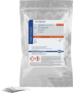 Plicuri cu reactivi ambalate individual pentru determinarea fotometrică a fosfatilor in intervalul 0.02–4.5 mg/L PO₄³⁻.